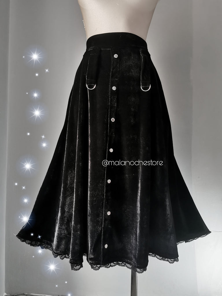-Falda larga de corte en silueta A, bolsillos en los costados , broches en acero inoxidable decorativos en el frente. Material 100% Polyester. Fotos en talla M largo 75cm .